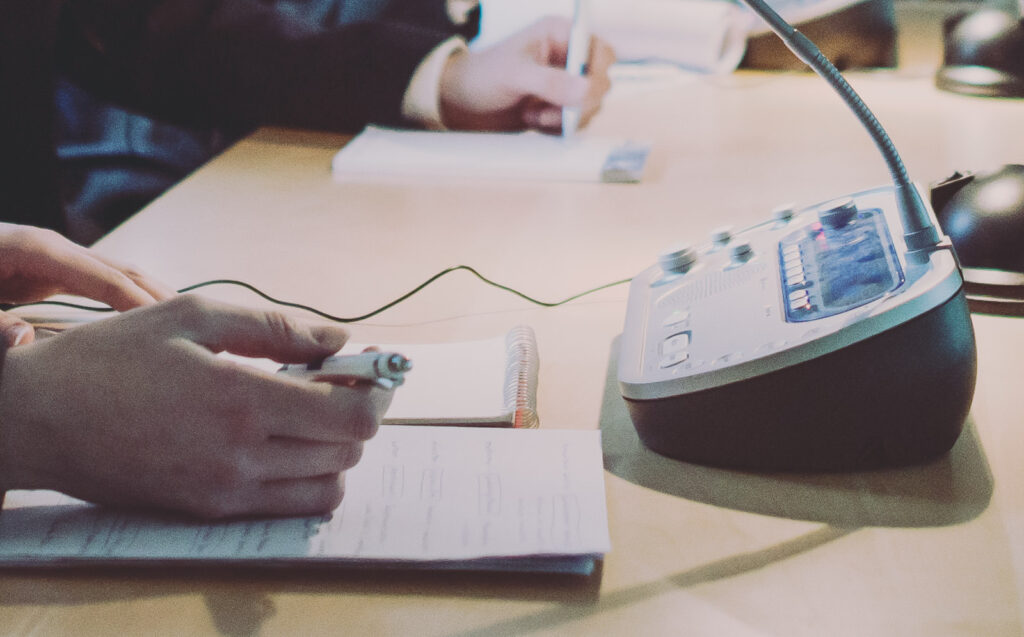 Die Konferenztechnik wird vor allem beim Simultandolmetschen benötigt. Zur Konferenztechnik zählen Personenführungsanlagen, schallisolierte Kabinen, Dolmetschpulte, Mikrofone, Empfänger sowie ggf. das entsprechende Technikpersonal. Gern beraten wir Sie, welche Technik Sie für Ihre Veranstaltung benötigen, und organisieren diese auf Wunsch für Sie mit.